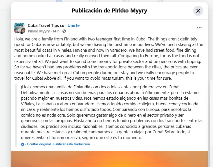 Sin saber exactamente qué esperar, Pirkko y su familia disfrutaron de un viaje que superó todas sus expectativas. Aunque reconocen las dificultades que enfrentan los cubanos en estos tiempos, su experiencia fue excepcional e incluyó desde alojarse en casas particulares llenas de encanto hasta disfrutar de la deliciosa gastronomía local.